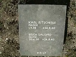 Ritscherle survived the war, and returned to duty for World War II ranked as a major. During the Battle of Britain, he was aboard a Heinkel He 111 as an observer of 9/KG53 that was shot down at 1600 hours on 24 August 1940 by Sgt W.L. Dymond of No. 111 Squadron RAF.[3] He bailed out, but drowned in the South Essex waterworks,[2] aged 42. He is buried at Cannock Chase German Military Cemetery, Staffordshire, England in a joint grave (Block 9, Row 5, Grave 27) with his colleague Feldwebel Erich Salomo, the aircraft's gunner, who was initially wounded and then killed when the aircraft dived into the ground. [4]