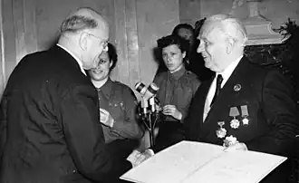 Within the East German leadership, Schirdewan, according to his own later recollection, continued to urge colleagues to respond more actively to the de-Stalinization agenda coming out of Moscow throughout 1957, with the further possibility that this might open the way for German reunification on acceptable terms.[7] However, a sign of the hardliners' views on de-Stalinization was a return to show trials. It is true that the sentences handed out to Wolfgang Harich, Walter Janka and their alleged fellow conspirators[19] in 1957 were less savage than those received by Johann Burianek or Günter Stempel in 1952,[20] and the propaganda accompanying the show trials in 1957 was less shrill than it had been earlier in the decade. Nevertheless, there was nothing in the government's domestic policy to suggest that the Communist regime was about to apply the radical reformist thinking advocated by Khrushchev the previous year. Meanwhile, Moscow was increasingly preoccupied with events in Hungary, where the fast moving aftermath of the Secret Speech had culminated in a government declaration of intent to withdraw from the Warsaw Pact at the end of October 1956, and a Soviet military intervention with tanks on the streets of Budapest in November. Khrushchev had apparently come into line with the hardline faction headed up by his Kremlin deputy Vyacheslav Molotov. With Khrushchev distracted and possibly losing influence in Moscow, in East Berlin, Walter Ulbricht, backed by senior colleagues who included Erich Mielke and Erich Honecker,[2] felt strong enough to move against Karl Schirdewan.[7] In October 1957, Schirdewan and his fellow reformer Ernst Wollweber resigned from key offices. The climax of the downfall came on 5 February 1958, when Schirdewan was expelled from the Party Central Committee.[1] The expulsion, enacted at the 35th Plenum of the Central Committee, was attributed to "Factionalism" ("Fraktionstätigkeit")[21] and was accompanied by a "stern rebuke" ("strenge Rüge").[8] The expulsion had come despite a plea from Khrushchev at a meeting in Moscow a couple of weeks earlier (to which, as minutes of the meeting indicate, Ulbricht had agreed) that Schirdewan should at least retain his Central Committee membership.[21] Karl Schirdewan was placed in charge of the National Archives at Potsdam, which, from the perspective of the national leadership team, was seen as a "punishment job".[22]