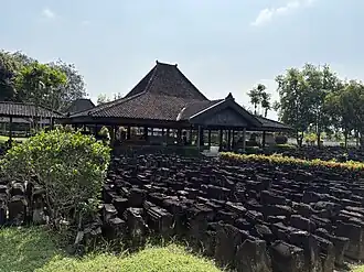 ![]() Ruins of stone carvings from Borobudur stacked against the Javanese Pendapa at Karmawibhangga Museum | |