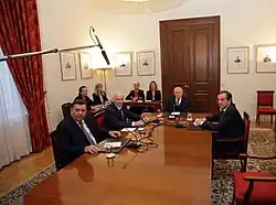 After securing the support of the two major political parties, Papoulias was re-elected to a second and final term on 3 February 2010 with a parliamentary majority of 266 votes.[21] His second term in office was mired in the country's worsening financial crisis and large demonstrations and protests. This resulted in successive changes of government of different political orientations, with the appointment of conservative, socialist, socialist-conservative and left-wing governments.[22]