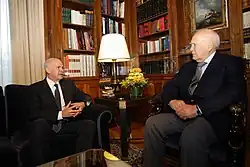 On 12 December 2004, Prime Minister Kostas Karamanlis, leader of the governing New Democracy party, and George Papandreou, leader of the PASOK opposition, nominated Papoulias for the presidency. That same day Karamanlis made it public in a televised message. In fact, he had already communicated this decision to Papoulias in a phone call on 5 December, as he had been discussing his candidacy with him since the summer. Papoulias won over the other four candidates that PASOK and ND had been negotiating.[15][16] On 8 February 2005, he was elected by 279 of 300 votes to a five-year term.[17] He was sworn in as the 6th President of the Third Hellenic Republic on 12 March 2005, succeeding Konstantinos Stephanopoulos.[18]