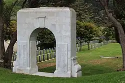 In addition, the CWGC erected the Wellington Provincial Memorial, in the form of a marble arch connecting the two Services sections, inscribed with the names of service personnel from Wellington Province who died serving in the World Wars but have no known grave.[3]