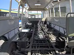 Karosa ŠL 11 is completely different from its predecessor, Škoda 706 RTO-CAR, which had engine in front and two doors. ŠL 11 is a model of Karosa Š series. It is derived from Karosa ŠM 11 city bus, and also unified with long-distance coach Karosa ŠD 11. Body is semi-self-supporting with frame and engine with manual gearbox in the middle, between the wheels. Only rear axle is propulsed. Front axle is independent, rear axle is solid. All axles are mounted on air suspension. On the right side are two folding doors (first are narrower than middle doors). Inside are used leatherette seats. Driver's cab is not separated from the rest of the vehicle.