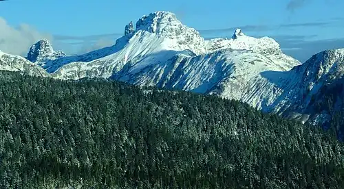 Large peak is unofficially called Castle Mountain with the sharp Pin Peak alongside it. Castle Mountain (3,866 feet) is the highest point of Karta River Wilderness.