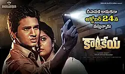A 90 seconds teaser was launched on 1 December 2013 at Hyderabad.[30] The first look poster featuring Nikhil Siddhartha and the temple was unveiled on 5 February 2014.[31] The first look posters of Tamil version titled Karthikeyan were unveiled on 5 March 2014.[32] On 18 October 2014 the making video of the film's posters was released.[33] On 21 October 2014, Nikhil and the film's unit conducted a publicity tour in five towns viz. Guntur, Vijayawada, Eluru, Rajahmundry and Kakinada to paste the first release posters of the movie respectively.[34] Nikhil, Swati and Chandoo promoted the film on the talk show Ali Talkies hosted by comedian Ali.[35]