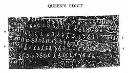 The edict also identifies her as mother to their son, Prince Tivala (also referred to as Tivara), who is the only son of Ashoka mentioned by name in his inscriptions.[4][5][6]
