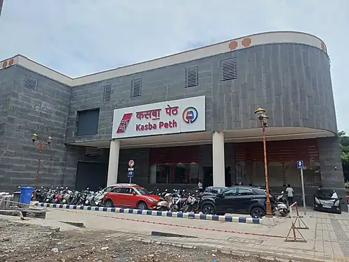 Kasba Peth is an underground southern terminal metro station on the north–south corridor of the Purple Line of Pune Metro in Pune, India. The station was opened on 29 September 2024 as the final extension of Pune Metro Phase I.[1] During the planning phase, this facility was officially designated as Budhwar Peth metro station. However, it was renamed as Kasba Peth metro station due to its location in Kasba Peth.[2]