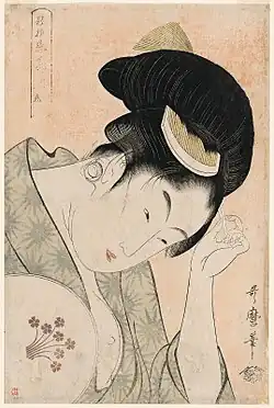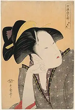 Kitagawa Utamaro (c. 1753–1806) made his name in the 1790s with his bijin ōkubi-e ("large-headed pictures of beautiful women") portraits, focusing on the head and upper torso, a style others had previously employed in portraits of kabuki actors.[4] Utamaro experimented with line, colour, and printing techniques to bring out subtle differences in the features, expressions, and backdrops of subjects from a wide variety of class and background. Utamaro's individuated beauties were in sharp contrast to the stereotyped, idealized images that had been the norm.[5]
