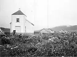 In 1917, when visited by the USCGC McCulloch, Kashega was noted as being "fairly well located and drained," a prosperous village with plentiful salmon, in sharp contrast to the poor sanitation of nearby Makushin.[2] In 1930, when visited by USCGC Unalga, the village was observed to be in good condition, consisting of a church, schoolhouse, and 15 small frame houses.[3] The population at the time was about 38.[3]