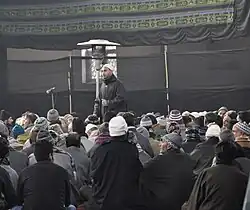 Marsiya in Kashmir manifests as public performances, primarily recited during mourning assemblies [Kashmiri: majlis ] held within an imambada. After composing a marsiya, the musanif hands it over to the zakir, whose responsibility is to recite it in the public. Historically, the musanif refrains from reciting his work, this is the role of the zakir.[7] The role of a zakir is hereditary,[53] with the right to recite any assigned marsiya being passed down from father to son.[3][6][7][27]