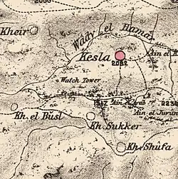 In 1883, the PEF's Survey of Western Palestine described Kesla as "a small stone village in a conspicuous position on the top of a rugged ridge, with a deep valley to the north. There is a spring to the east, and two more in a valley to the south. This is the site of Chesalon."[22]