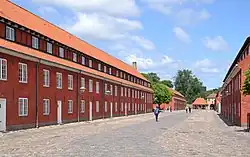 The Rows (Danish: Stokkene) are six two-storey terraces which were originally built by Henrik Ruise as barracks for the soldiers based at the Citadel. The dorms measured four by four metres and contained two triple beds, a small table and two benches. Over time they became known under individual names: General Stock where the commanders resided until the Commander's House was built, Artillery Stock for the artillerists, and Star Stock, Elephant Stock, Swan Stock and Fortuna Stock. The Mansard roofs are not part of the original design but date from 1768 when the rows were altered. The original roof profile is today only seen at the end of Artillery Row as seen from the Prince's Bastion.