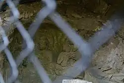 The term magaibutsu (磨崖仏) refers to a Buddhist figure carved directly into a natural rock faces or cliffside.[2] The Kasugayama Stone Buddhas are located in a national forest several hundred meters northeast of the Jigokudani Stone Buddhas, which has a separate National Historic Site designation. The site consists of two artificial caves, one east and one west, carved into a south-facing tuff rock wall. The Buddha statues carved into the inner walls. The eastern cave is centered on exoteric Buddhism, while the western cave is centered on esoteric Buddhism. The eastern cave has an opening of 4.7 meters, a depth of 3 meters, a back wall width of 4 meters, and a height of just over 2 meters. Four statues of Jizo Bosatsu are carved on the west wall, and three statues of Kannon Bosatsu are carved on the east wall. In the center of the cave is a 2 meter-tall stone pillar that is thought to have been built as a multi-tiered pagoda, and is caved with four Buddhas, one on each side. These are presumably Yakushi Nyorai on the east, Shaka Nyorai on the south, Amida Nyōrai on the west, and Miroku Bosatsu on the north. The western cave has an opening of 4.7 meters and a depth of 2.3 meter. A statue of Tamonten, stepping on a demon and wearing a flame halo, is carved in the corner of the west wall. Next to it is a seated statue of Amida Nyorai, and next to it is a statue of Fukujyoju Nyorai and a statue of Dainichi Nyorai. [3] The seated Buddha statues are presumed to represent the Five Vajrayana Buddhas, but two of the five have been lost.