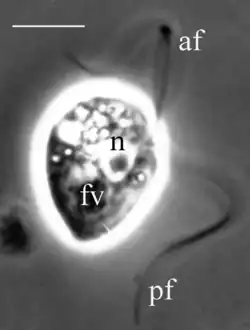 | Light contrast microphotograph of K. gromovi showing anterior (af) and posterior (pf) flagella, a nucleus (n) and a vacuole (fv) | |
