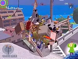 Objects that are smaller than the katamari will stick to it when the player comes into contact with them, while greater objects can be hurdles; colliding at high speed with any may cause objects to fall off the katamari, slowing the player's progress. The game uses size, weight, and surface area to determine if an object will stick to the katamari. This allows slender objects, such as pencils, that are longer than the katamari is wide, to be picked up, and these will alter how the katamari rolls until more objects are picked up.[1] Animals such as cats will chase the katamari, knocking things from it, but once the katamari is great enough, it will scare the animals away, and they can be rolled up once they are chased down. As objects stick to the katamari, the katamari will grow, eventually allowing objects that were once hurdles to be picked up, and creating access to areas that were formerly blocked. In this manner, the player might start the game by picking up thumbtacks and ants, and slowly work up to the point where the katamari is picking up buildings, mountains, and clouds.[1]