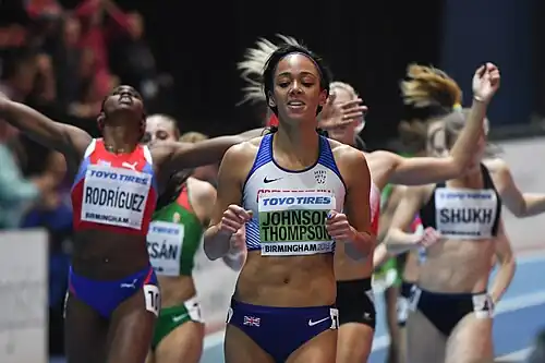 Katarina Mary Johnson-Thompson (born 9 January 1993)[1] is an English athlete. A multi-eventer, she is primarily known as both a heptathlete and an indoor pentathlete. In heptathlon she is a double world champion, double Commonwealth Games champion and an Olympic and European silver medallist. In indoor pentathlon, she is a world and double European champion.