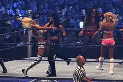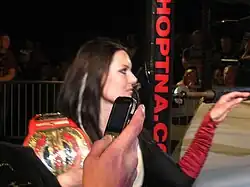 On 19 May, on Raw, she had a confrontation with the Women's Champion, Mickie James where she insinuated James had used her relationship with John Cena to sleep her way to success.[38] Two weeks later, Lea teamed up with Beth Phoenix in a winning effort defeating James and Melina, in which she pinned James.[39] On 16 June episode of Raw, Lea and Burchill defeated James and Mr. Kennedy in a mixed tag team match, where Lea pinned James a second time, thus earning a title shot[40] At the Night of Champions pay-per-view, Lea challenged Mickie James for the WWE Women's Championship but was unsuccessful in capturing the title.[41] On 14 July episode of Raw, Lea once again challenged James for the Women's Championship, but was unsuccessful. After she and her brother beat James and Kofi Kingston,[42] she received another chance at James' title in August but failed to win.[43]