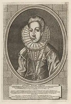 Princess Katarzyna Ostrogska (Ukrainian: Катерина Острозька, Lithuanian: Kotryna Ostrogiškaitė) (1560–1579) was a Ruthenian noblewoman. She is renowned for the 1577 Siege of Dubna, during which nomads laid siege to the city with the intention of capturing her.