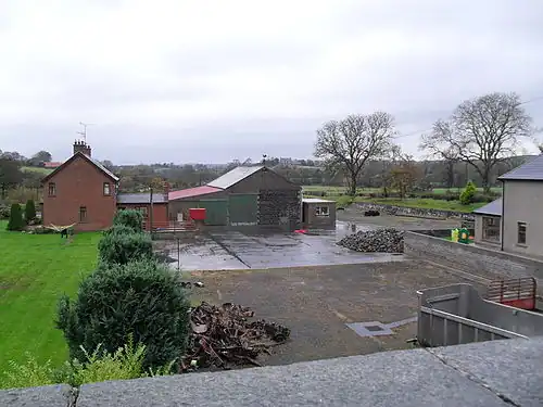 ![]() Katesbridge Station opened in 1880. The trackbed ran between the goods shed (now a barn) and the red brick house (this is a later dwelling) - the hedge marks it out quite well. The view is towards Banbridge. Photograph 29 October 2009 | |||||||