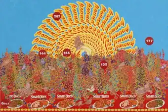 Kuharic targeted middle-class suburban culture, McMansions and Midwestern stereotypes in subsequent exhibitions at the Contemporary Art Museum St. Louis ("The World Brought Low,", 2005) and Bruno David Gallery ("Working in the Lou," 2012).[34][33][19] The former show included Jack's Originals (2004), a restaging of the expulsion from the Garden of Eden that portrays a casually dressed, middle-aged group atop jerry-built scaffolding made of potato chip bags, cheeseburgers, plates of club sandwiches, hams and other goods; a giant sun composed of a central frozen pizza package and plastic detergent bottles hovers above them.[3][8] Critic Jessica Baran described works in the latter show, such as Ladue News (2010), as "big-box surrealist nightmares-as-paintings."[35] That painting depicted affluent groupings (culled from society magazines) ascending towards an expanding, sphincter-like mandala of product containers that seems to threaten the ramshackle building in which they are placed.[33][35][36]