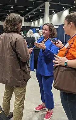 In 2023, Rep. Katie Porter joined writers in solidarity on the picket line during the WGA strike at The Culver Studios in Los Angeles. Addressing the crowd Porter said, “One of the things I love about this movement is that you guys are in it to stand up to corporate power and set an example for all of your brothers and sisters who are workers, who are unionized, and who are struggling to have labor rights.” While speaking to Deadline Hollywood, Porter stated that “corporations are using innovation and technology as an excuse to bust unions, and it’s absolutely unacceptable,... So this strike is about the entertainment industry, but it’s also about so much more.”[104] Porter also joined the SAG-AFTRA, WGA picket line outside Paramount Studios in August 2023. She stated, “I’m here today to stand with the SAG-AFTRA workers to listen and to learn from them and to make it clear that workers have the right to bargain.”[105]