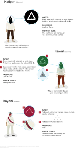 When the Katipuneros had expanded to more than a hundred members, Bonifacio divided the members into three grades: the Katipon (literally: Associate) which is the lowest rank, the Kawal (soldier), and the Bayani (Hero or Patriot). At the meeting of the society, Katipon wore a black hood with a triangle of white ribbon having the letters "Z. Ll. B.", corresponding to the roman "A. N. B.", meaning Anak ng̃ Bayan (Son of the People, see below). Kawal wore a green hood with a triangle having white lines and the letters "Z. LL. B." at the three angles of the triangle, and also wore a green ribbon with a medal with the letter (ka) in Baybayin script above a depiction of a crossed sword and flag. The password was Gom-Bur-Za, taken from the names of the three martyrs Mariano Gomez, Jose Burgos and Jacinto Zamora. Bayani (Hero) wore a red mask and a sash with green borders, symbolizing courage and hope. The front of the mask had white borders that formed a triangle with three Ks arranged as if occupying the angles of a triangle within a triangle, and with the letters "Z. Ll. B." below. Another password was Rizal. Countersigns enabled members to recognize one another on the street. A member meeting another member placed the palm of his right hand on his breast and, as he passed the other member, he closed the hands to bring the right index finger and thumb together.[38]