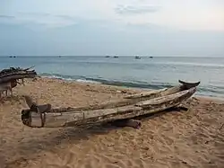 Kattumaram (Tamil: கட்டுமரம்) is a traditional Tamil watercraft used in the Coast of Southern India, Sri Lanka, and Bangladesh. They are characterized by being made from three to seven tree trunks tied together with fiber lashings and/or treenails.[1] The lashings are not permanent and the individual tree trunks are commonly separated to dry under the sun when kattumaram are beached. Most kattumaram are rafts because they are not watertight and rely on the buoyancy of the individual logs. However, some types of kattumaram known as teppa are watertight due to the addition polystyrene fillings on the hull and thus are true boats. They are propelled by oars, paddles, or lateen or lug sails. Modern versions of the kattumaram made from fibreglass are known as "fibre-teppa".[2]