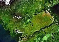 The Katwe craters or Katwe-Kikorongo explosion craters are a group of volcanic craters within Queen Elizabeth National Park in Toro, Uganda.[1] The volcanic field is roughly 210 km2 (81 sq mi) in size.[2] The individual craters vary widely in size, but the largest are up to 3 km (1.9 mi) in diameter and 100 m (330 ft) deep.[3] The unusual formations were formed individually by a series of violent volcanic explosions over the last 1 million years.[3] These maar craters are a result of magma coming in contact with groundwater driving large steam explosions. The explosive events created large, low lying craters with few other signs of volcanic activity.