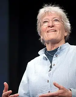 Katharine Boynton "Katy" Payne (born 1937) is an American zoologist and researcher in the Bioacoustics Research Program at the Laboratory of Ornithology at Cornell University. Payne studied music and biology in college and after a decade doing research in the savanna elephant country in Kenya, Zimbabwe, and Namibia, she founded Cornell's Elephant Listening Project in 1999.[1]