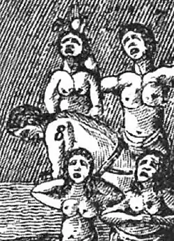 8. Kahekil's brother Kaiko and 6. wife Wahinepio mourning alongside 7. Kalākua Kaheiheimālie and two unidentified women during Queen Keōpūolani's funeral.