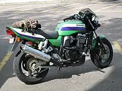 The ZRX1100 and the later ZRX1200 were styled like 1980s muscle bikes, which were large bikes with large engines. They were also considered Universal Japanese Motorcycles.[2] The Suzuki Bandit 1200 has been credited with leading this niche, taking a large-displacement from an early air/oil-cooled engined race replica sport bike and detuning the engine for greater low-rpm torque and easier riding, replacing the aluminum frame with steel, and leaving off the full fairings, lowering cost while losing road racing focus in favor of all-around street sport riding.[8] One of the colour schemes replicates Eddie Lawson's 1981 and 1982 AMA Superbike Series-winning Kawasaki KZ-1000s.[3][9] There were several models, such as the R which had a bikini nose fairing, with a square headlight.