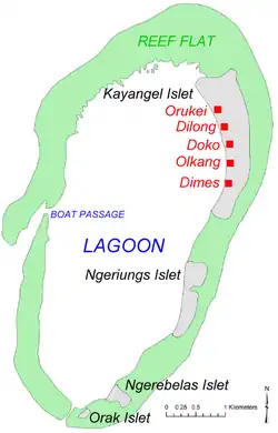 - ^ Olsudong, Rita (2006). Final Inventory of Historic Properties in Kayangel States, Republic of Palau. Bureau of Arts and Culture, Palau Historic Preservation Office, Ministry of Community and Cultural Affairs.