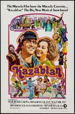 Kazablan is an Israeli film in the genre of musical and Bourekas films, directed by Menachem Golan[3] and starring Yehoram Gaon, Efrat Lavie, Arieh Elias, Etti Grotes and Yehuda Efroni. The script was written by Menachem Golan and Haim Hefer, and is based on the musical of the same name from 1966.[4] The film was released in Israel on July 7, 1973, and as of today is the second most watched film in the history of Israeli motion pictures,[5] with 1,222,500 tickets sold (the country's population at the time was about 2.8 million inhabitants). It was also released in the United States on May 8, 1974, by Metro-Goldwyn-Mayer.