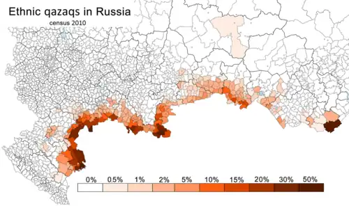 In Russia, the Kazakh population lives in the regions bordering Kazakhstan.[1] The 2010 Russian census recorded 647,732 Kazakhs living mostly in the Astrakhan Oblast, Volgograd Oblast, Samara Oblast, Orenburg Oblast, Chelyabinsk Oblast, Kurgan Oblast, Tyumen Oblast, Omsk Oblast, Novosibirsk Oblast and Altai Krai regions. During the 1920s significant numbers of Kazakh families were left outside the designated Kazakh Soviet Socialist Republic; after the end of the Soviet Union in 1991, they acquired Russian citizenship and many moved to major Russian cities such as the capital Moscow and St. Petersburg.
