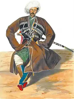 Kazi-Beg's son Gabriel was made an aznauri, noble of a lower rank, and adopted the surname Kazbegi (Kazbek). He played a role in the Russian-Georgian interaction and pledged his loyalty to the Russians upon their annexation of Georgia in 1801. When the Georgian princes of the deposed Bagrationi dynasty rallied Georgian and Ossetian highlanders against the Tsar's rule in 1804, Gabriel Kazbegi fought in the Russian ranks and was promoted to major. The clan ran Stepan-Tsminda – henceforth frequently referred to as Kazbek in Russian accounts – and Khevi as their fief. Gabriel's son Mikheil (1805–1876) fought in the Caucasian War and was made a major general of the Russian army in 1859. Mikheil's son was the famed Georgian prose writer Alexander Kazbegi.[2][3]