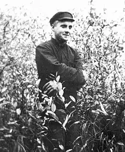 In 1940, following the Soviet Union's occupation of Lithuania, 19-year-old Vasiliauskas soon came face to face with the policies of the new regime. The Soviet authorities outlawed all organizations, including Ateitininkai.[3][4] As a prominent leader within this now-illegal organization, Vasiliauskas discovered that he had been placed on an NKVD arrest list.[5][6] In the spring of 1941, Vasiliauskas and several gymnasium friends attempted to cross the border into East Prussia, Germany. However, after crossing they were detained by the German authorities and transferred to the Soldau concentration camp, where they were held for three months.[1][7][8]