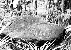 Kebon Kopi I also known as Tapak Gajah inscription (elephant footprint inscription),[1] is one of several inscriptions dated from the era of Tarumanagara Kingdom circa 5th century.[2] The inscription bearing the image of elephant footprint, which was copied from the elephant ride of King Purnawarman of Tarumanagara, which is equated with Airavata, the elephant vahana (vehicle) of Indra.[3]: 16