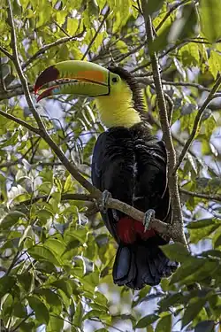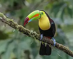 The keel-billed toucan (Ramphastos sulfuratus), also known as rainbow-billed toucan or sulphur-breasted toucan,[3] is a species of toucan native to southern Mexico, Central America and the far northwest of South America, and is found in tropical forests. It is the national bird of Belize. It is an omnivorous forest bird that feeds on fruit, seeds, insects, invertebrates, lizards, snakes, and small birds and their eggs.