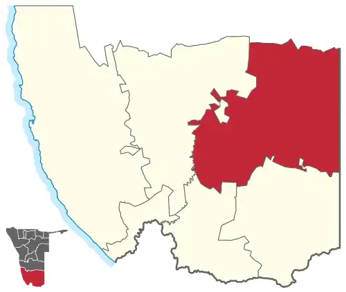 Keetmanshoop Rural is an electoral constituency in the ǁKaras Region of Namibia. It covers an area of 37,922 km2 (14,642 sq mi) and contains the Krönlein suburb of Keetmanshoop and the villages of Koës and Aroab, the settlements of Seeheim and Klein Karas, as well as several farming communities in the area. Keetmanshoop Rural had a population of 7,219 in 2011, up from 6,399 in 2001.[1] As of 2020 the constituency had 6,398 registered voters.[2]
