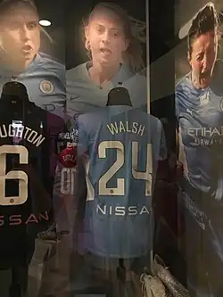 Walsh moved up to the Women's Super League (WSL) shortly after she turned seventeen.[64][56] She had been offered a place on Everton's development squad without trialling and was planning to join. Manchester City, the club Walsh supports, was preparing to enter the WSL and holding trials for their development squad. She was uncertain about the opportunity, but her mother encouraged her to attend the trials; before the session was complete, first team coach Nick Cushing, who had gone as an observer, wanted to sign Walsh to the main squad as their holding midfielder.[64][25] Cushing would later say that Walsh has "the best football brain" of any player he has coached,[6] adding that "some players are almost touched by God";[64] in response, Walsh deflected praise, saying that Cushing's coaching style benefits technical and tactical players.[47]