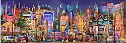 After the controversy, Drury moved away from oil on canvas and created a new style of artworks using 3D modelling. He used this technique to produce urban landscapes and cityscapes, featuring well-known local landmarks combined with elements of humor and political satire. Each picture can take up to three months to complete due to the complex modelling process and the high levels of detail included. Most of the scenes include a red telephone box, a red postbox and a clock which tells the same time. Drury deliberates for hours on inconsequential details such as a perforated brake disc on a Harley-Davidson motorbike.[4] Many British and international towns and cities are featured in the artworks.[7][8][9]