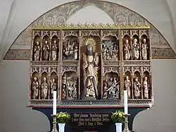 The late-Gothic triptych altarpiece is from the late 15th or early 16th century. The central figure is the saint to which the church is dedicated: Andrew with his cross. He is accompanied by lateral scenes from his legend.[3][4] Recent research by the Danish National Museum has established the probable date of the triptych's creation as the beginning of the 16th century.[5]