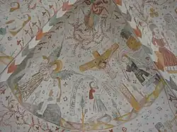 The old frescoes were discovered in 1883 and restored by J. Kornerup in 1890. In 1934, smoke deposits from the old heating overs were removed as were Kornerup's painted additions. The wall paintings date from various periods. The oldest, of which only fragments remain, are from about 1275. They are located on the walls of the choir. A second series, from 1325, date from the decoration of the walls in the nave. A depiction of the Trinity can be seen over the triumphal arch. The walls are decorated with holy figures, standing or sitting, in varying formats. They include images of what appear to be the Archangel Gabriel and Uriel. They are followed by the apostles, including Batholomy, Paul, Jacob and Andrew. At the foot of the wall, in a quadrangular area, there is a crucifixion grouping with Mary, John and a warrior, possibly belonging to a now absent lateral altar.[2]