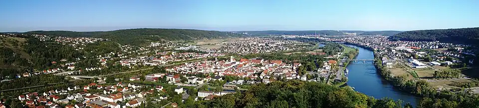 Panorama of Kelheim as viewed from the Hall of Liberation looking eastwards (direction Regensburg). To the left, slopes of the Franconian Jura; to the right the Lower Bavarian Upland. Danube river in between.