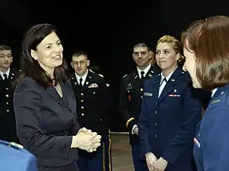 Ayotte included provisions in the Veterans' Access to Care through Choice, Accountability, and Transparency Act of 2014 to allow New Hampshire veterans to receive medical care closer to home.[62] She was the only member of the New Hampshire delegation to vote against a budget proposal the singled out veterans' benefits for cuts.[63] She offered and cosponsored legislation to give veterans access to cutting-edge prosthetics, strengthen mental health services for veterans and their families, and improve the support system for military families.[64][65][66]