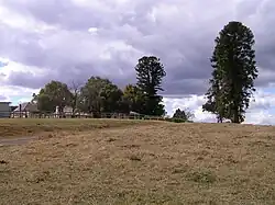 The remnants of the early layout include part of an ironstone gravel drive, fine lawns, the gravelled forecourt to the stables behind (west) of the house and large old trees. The trees of most heritage value are considered to be the two pines which include hoop pines (Araucaria cunninghamii), brown pine (Podocarpus elatus), Canary Island pine (Pinus canariensis), and Monterey pines (Pinus radiata). Two large camphor laurels (Cinnamomum camphora) flank the view from the front door, in the carriage loop.[1]