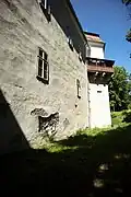 The castle has a square-shaped plan, courtyard and corner towers, two larger and two smaller. Several windows have frames in Renaissance style. Built above the entrance is a picturesque stone balcony on consoles. The consoles can be seen at the floors of the towers. The entrance is on the north side, on a bridge over the outside ditch of the castle. Old documents show that the former citadel (13th century) was protected by moats, walls and towers positioned below the plateau on which the castle was built. These were destroyed during post-war reconstruction work.