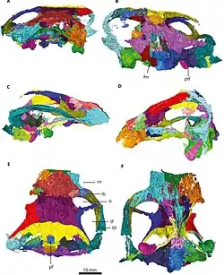 1. ^ a b c d e f g h i j k Angielczyk, K.D.; Benoit, J.; Rubidge, B.S. (2019). "A new tusked cistecephalid dicynodont (Therapsida, Anomodontia) from the upper Permian upper Madumabisa Mudstone Formation, Luangwa Basin, Zambia". Papers in Palaeontology. 7: 405–446. doi:10.1002/spp2.1285. S2CID 210304700.