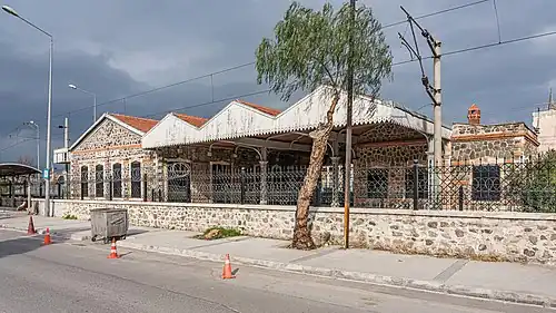 In 1856 the Ottoman Empire granted a concession to an English company to build a railway from İzmir to Aydın. The Ottoman Railway Company (ORC) started construction in late 1856 and completed a 2.17 km (1.35 mi) line, from the start at Alsancak to Kemer. Kemer station was opened in 1857 as Caravan Bridge (Turkish: Kervan Köprüsü), named after a nearby ancient bridge with the same name.[2][1] Kemer was chosen to be the main freight depot of the ORC in İzmir. When the railway reached the town of Torbalı in 1860, the first trains started to operate on the line. Freight trains carrying mainly figs, would unload at Kemer depot and would be distributed in İzmir via horse pulled wagons. Freight trains from the south as well as horse pulled caravans from the east and north would unload at Kemer.[1] In its early years Kemer station was the main freight depot in İzmir. When the railway reached Aydın in 1866, most freight would be unloaded in Alsancak. The Turkish State Railways became the new owners of the station in 1935, when they bought the ORC.[3] The station was renamed as Kemer around that time. The station was electrified with 25 kV AC catenary in 2001. In 2006 the station was closed to passenger traffic and rebuilt in 2008, to be re-opened to service in 2010.