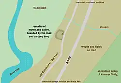 The bedrock of the site is marl, below a sandstone ridge,[1] at an elevation of 30 metres (location:51.64092, -2.88351).[2] It is positioned towards the lower part of the steep valley slope below Kemeys (or Kemys) Graig, which runs southwest to northeast overlooking the site and River Usk below it to the west. The old Caerleon to Usk road cuts through the very eastern side of the site and the A449 passes about 70 metres further east.[3]